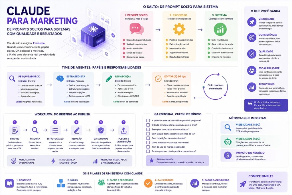 Claude no marketing não é “prompt”: é sistema. Veja como criar skills, QA editorial e workflows para ganhar velocidade sem perder consistência.